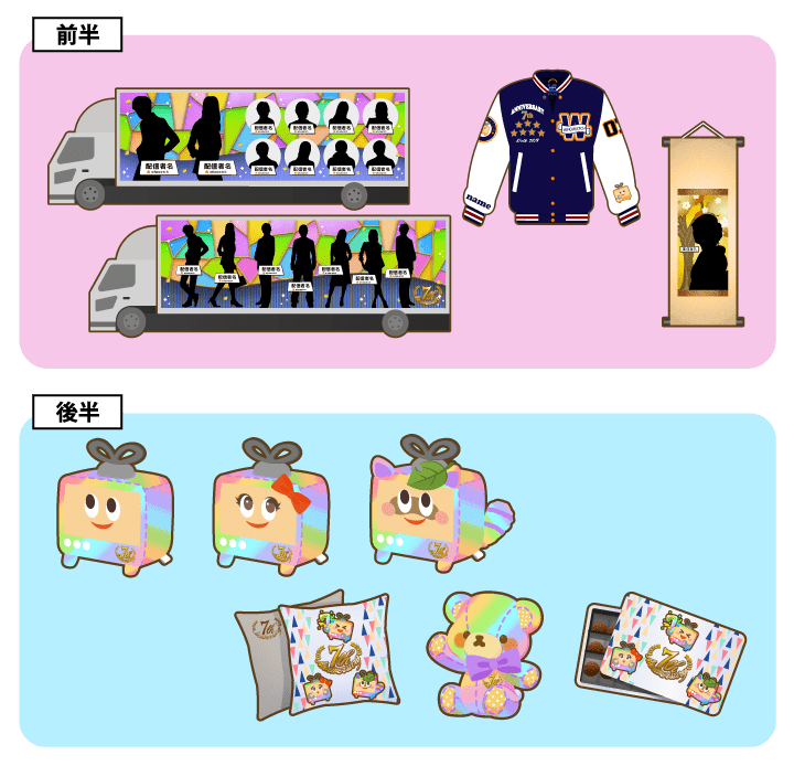 前半日程(2022年9月1日~6日)では、ふわっちで配信を開始した各年代毎の選ばれしトップ配信者たちが挑む、全ての特典が手に入る「Champion of 7th Anniversary」のグループを筆頭に、 記念トラック広告への掲載や記念スタジアムジャンパー・掛け軸 が手に入るグループをご用意。